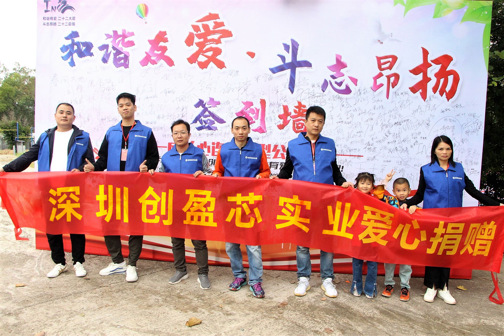 创盈芯实业代表在溪山中学活动现场拍照留恋