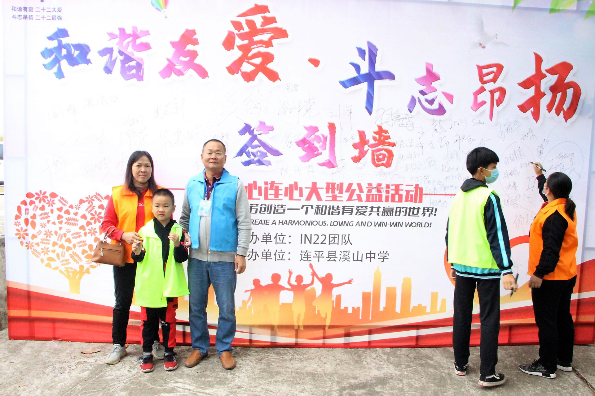 10月23日7:45-8:00,老师、家长和学生分别在“心连心,手拉手”爱心助学活动会场门口的签到墙留下自己的名字。