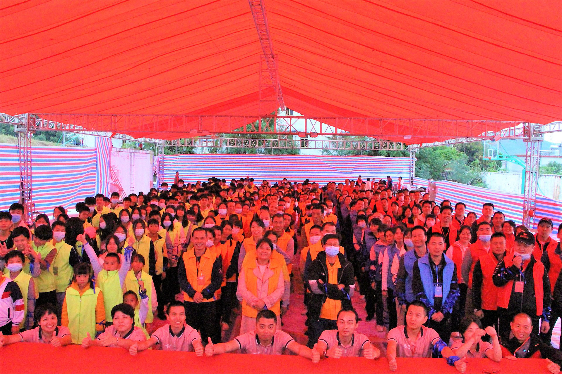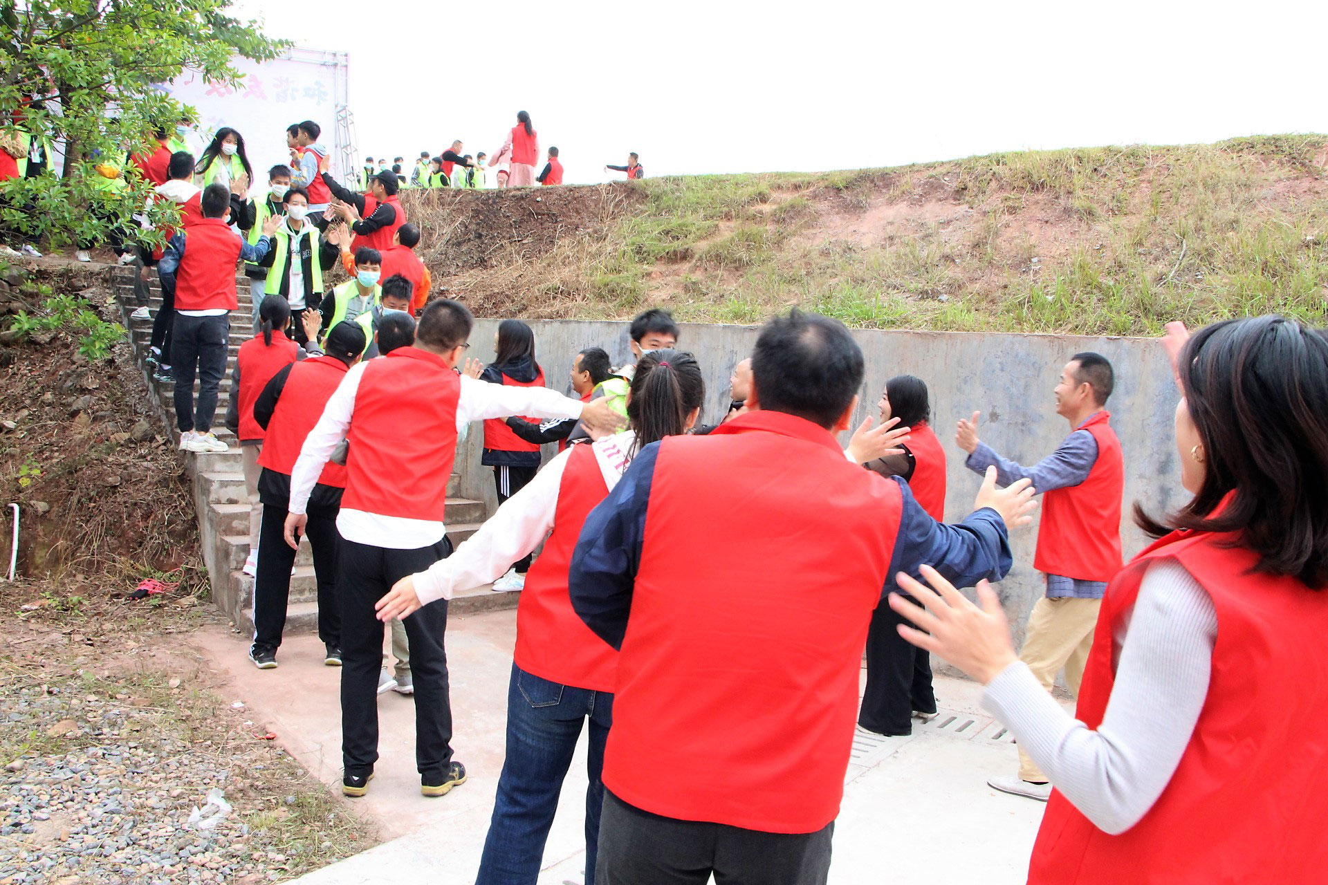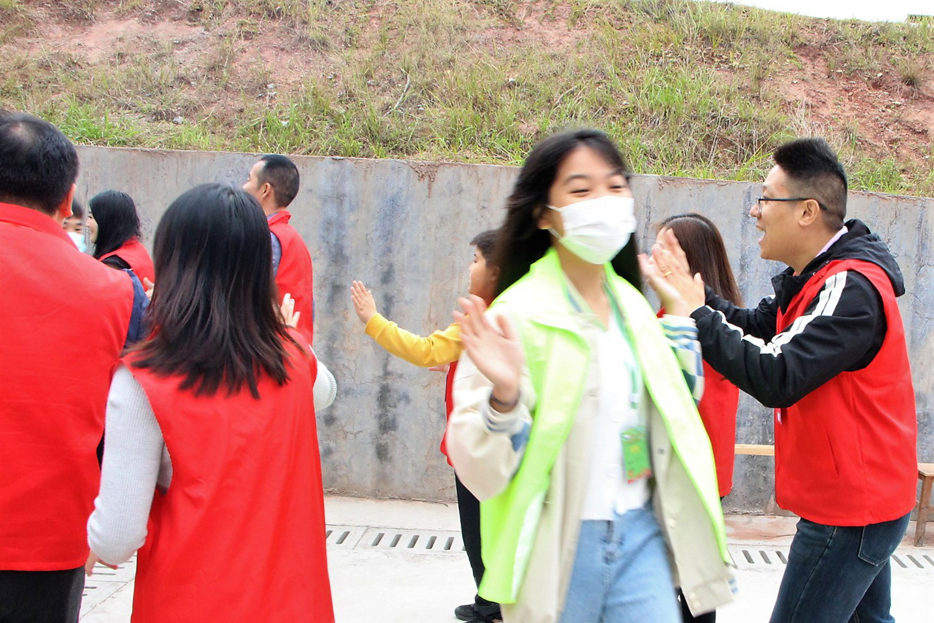 老师(蓝马夹)、家长(黄马甲)及学生(绿马夹)合影