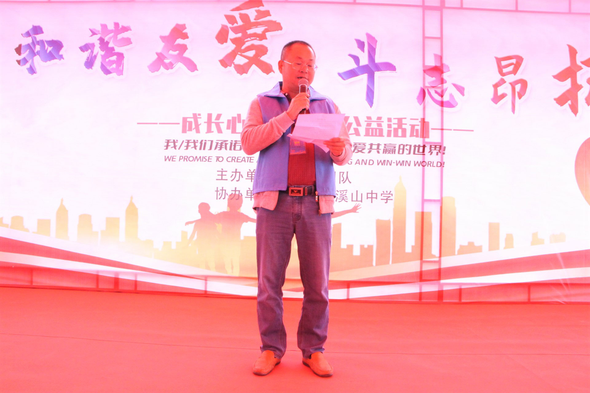 谢校长在8:00上台致辞宣布“心连心,手拉手”爱心助学活动正式开始,谢计党校长在现场表达了对于爱心团队的感恩,并揭示了这次活动全校师生的重视,以及对孩子的关怀及活动的期待。