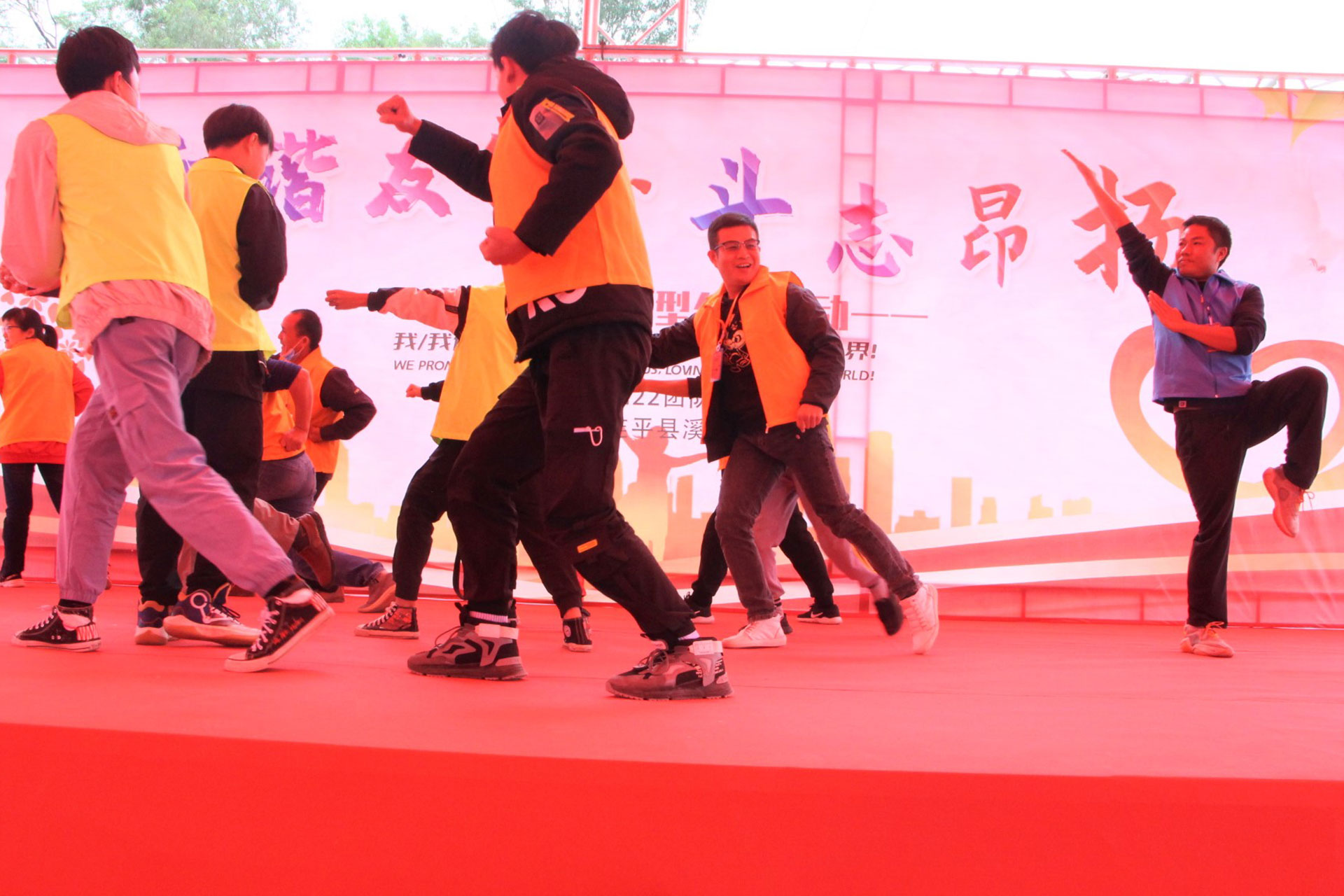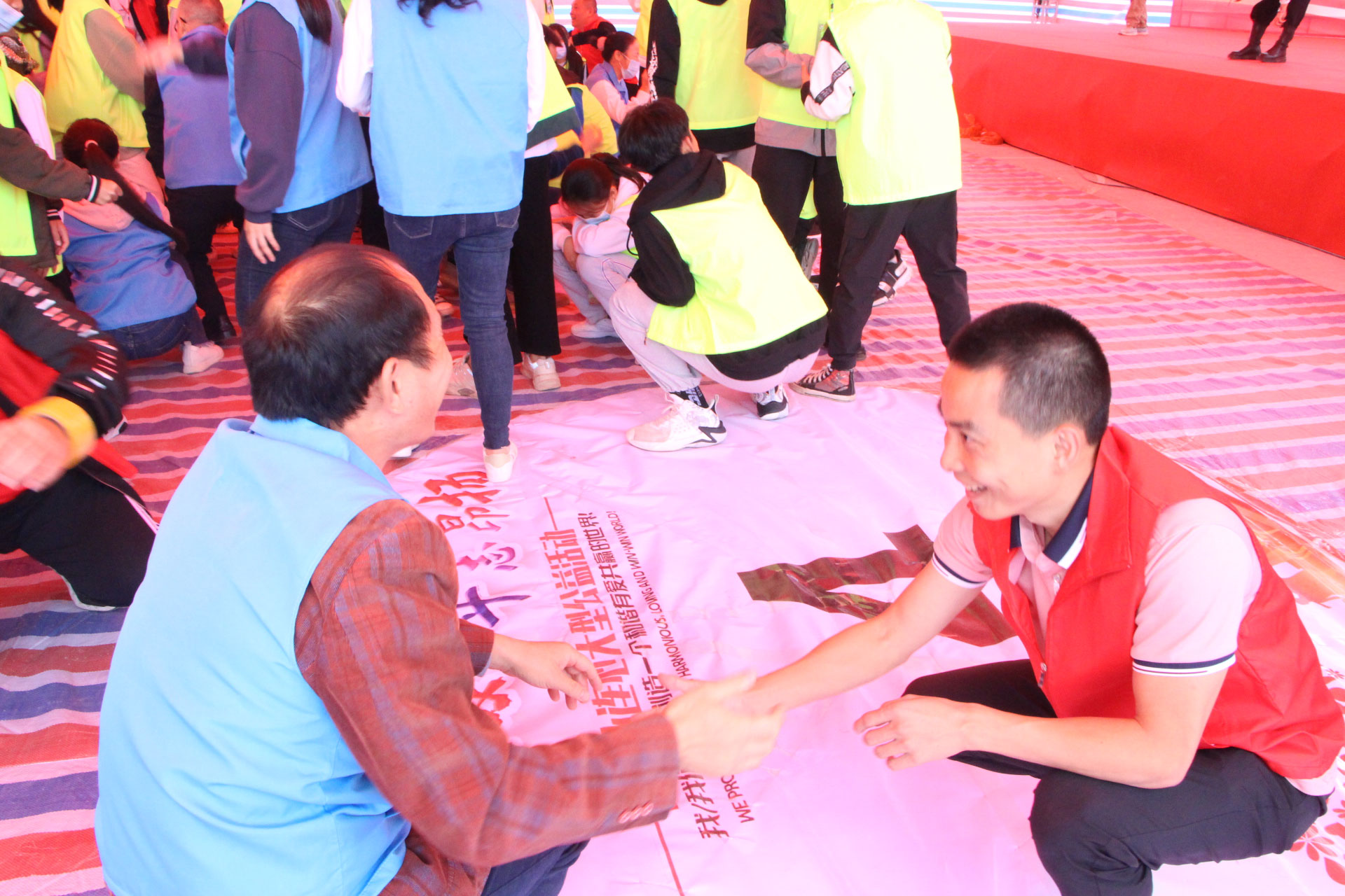 上午10:30全场进行《呼啦圈游戏》,全场人员分为20组,每组老师带领学生上台展示才艺。然后每组分配一大一小呼啦圈,20组争夺谁更加快速完成一圈的配合。