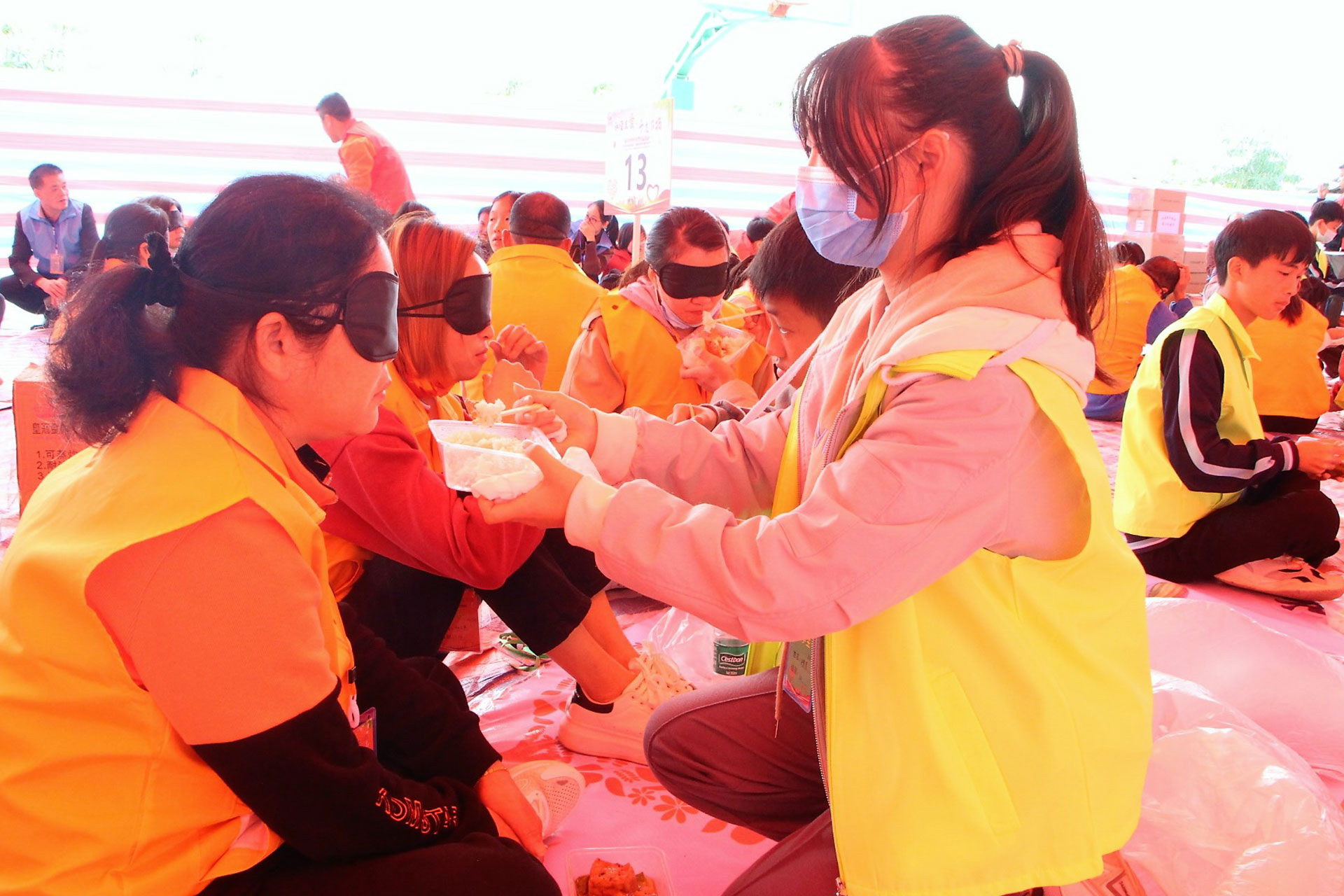 《天堂的午餐》时间定在中午,义工们11点半开始准备盒饭,让每一个家长蒙上眼睛。然后每一个孩子为自己的父母或爷爷奶奶亲自送上一份特别的礼物-喂餐给父母品尝。