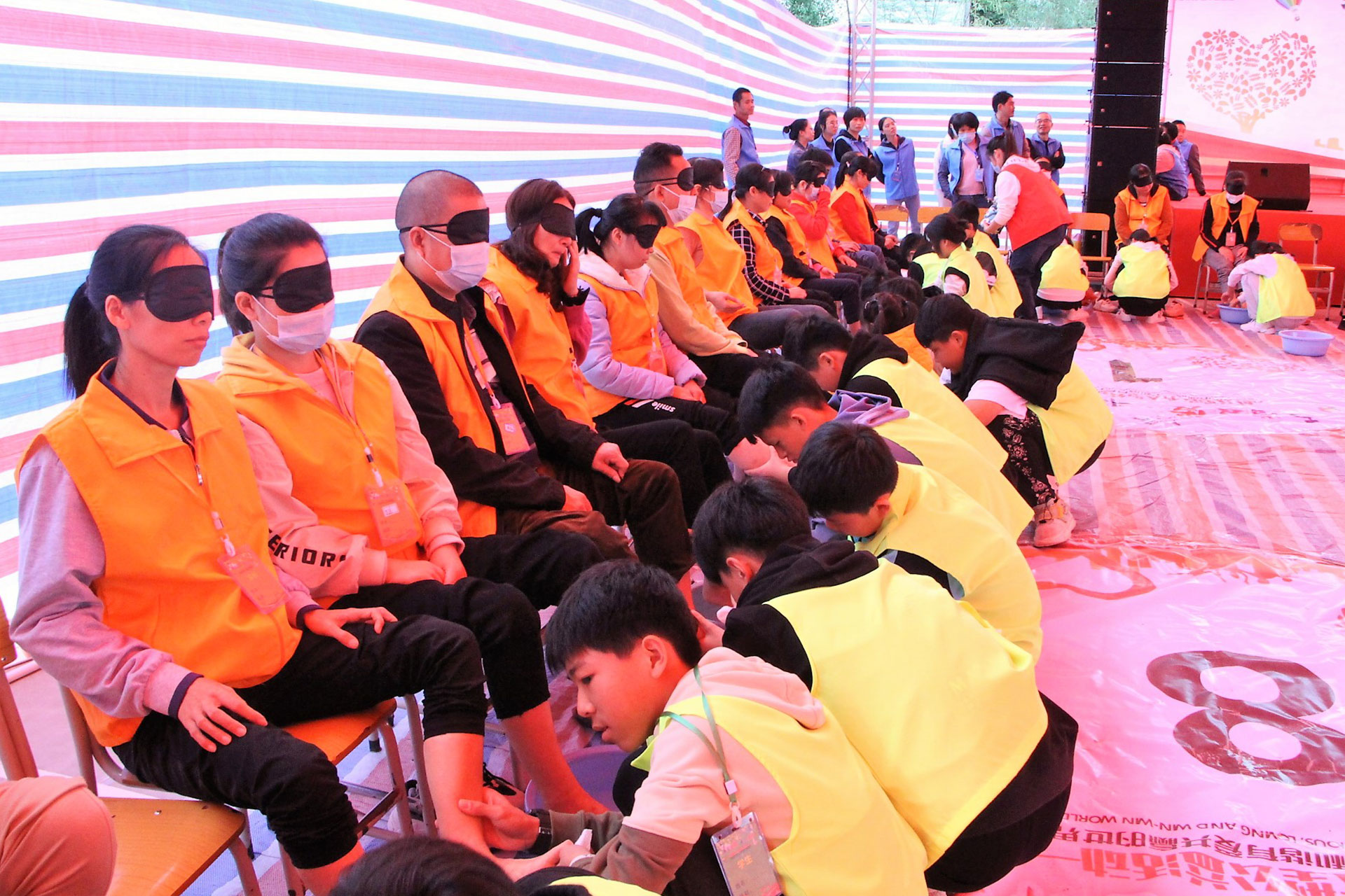 10月23日下午14点,全场进入到最强体验活动《漫漫人生路》。每个家长都被蒙上眼睛,由每个孩子引领他们的家长向前攀登课桌,走下楼梯和钻过狭小的呼啦圈。家长们紧紧跟追着孩子的步伐,当经历了一段艰难的路程后,孩子认真地为自己的家长洗脚穿鞋。