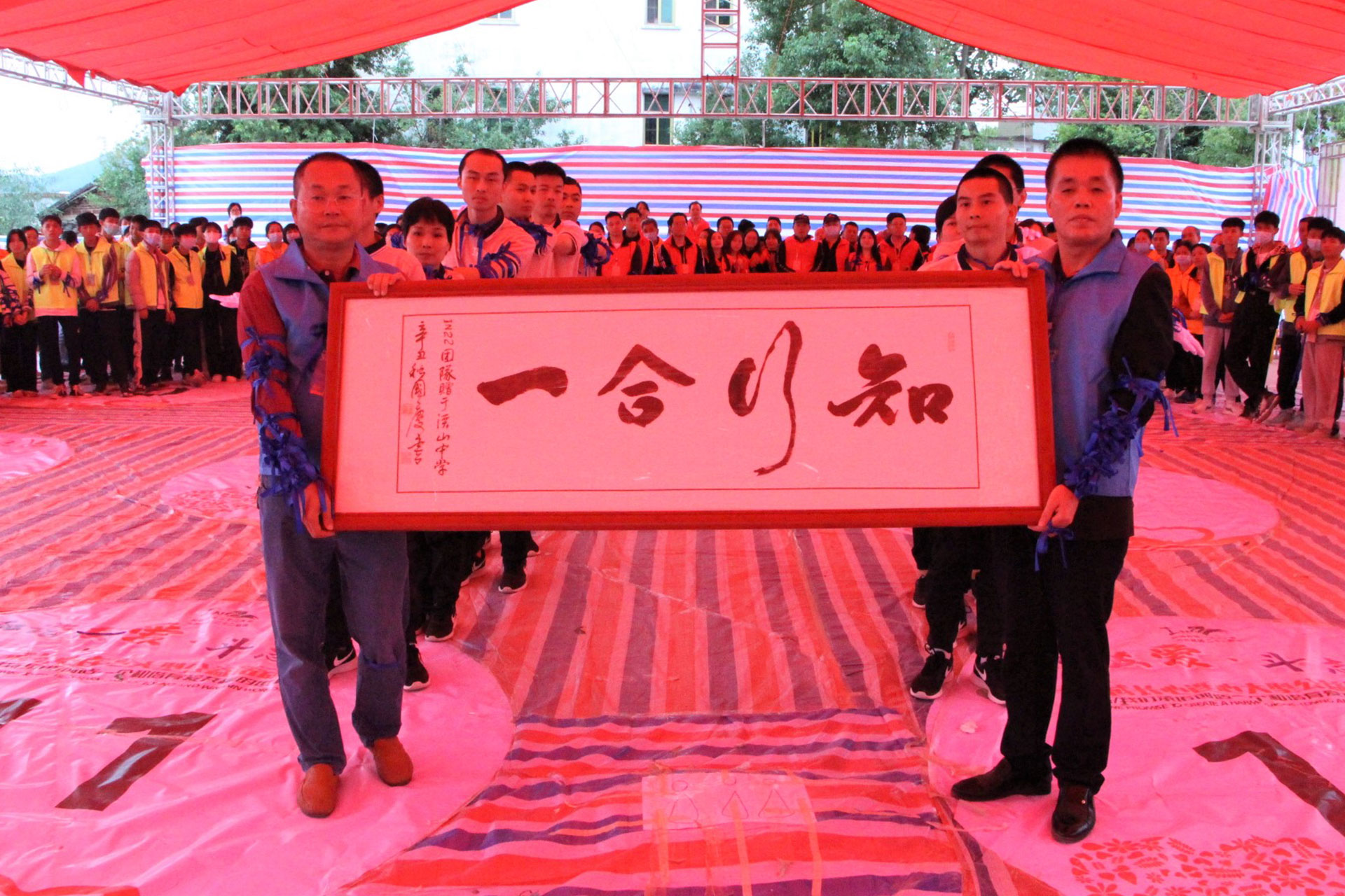 IN22团队在15:30为10名学生发放助学金,随后将《知行合一》的牌匾和孩子们的《梦想画卷》赠送给了校长。
