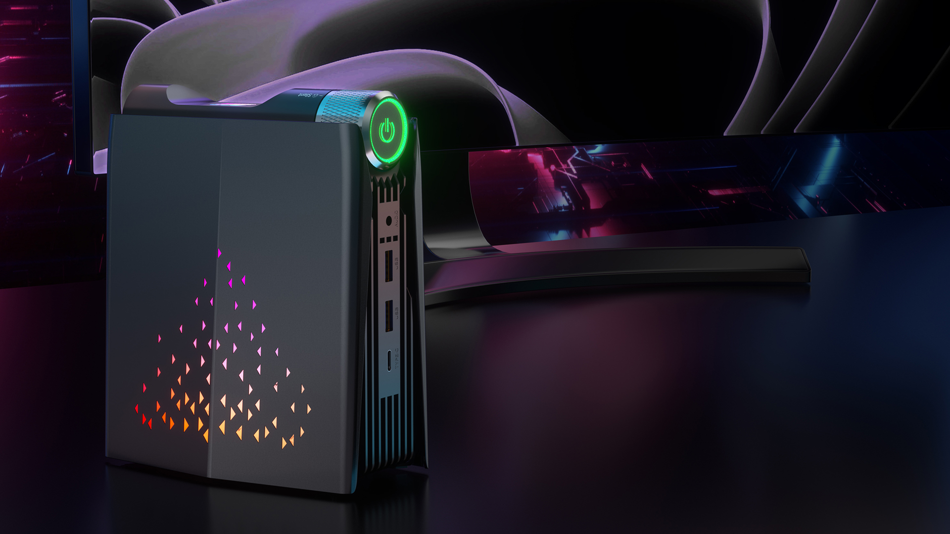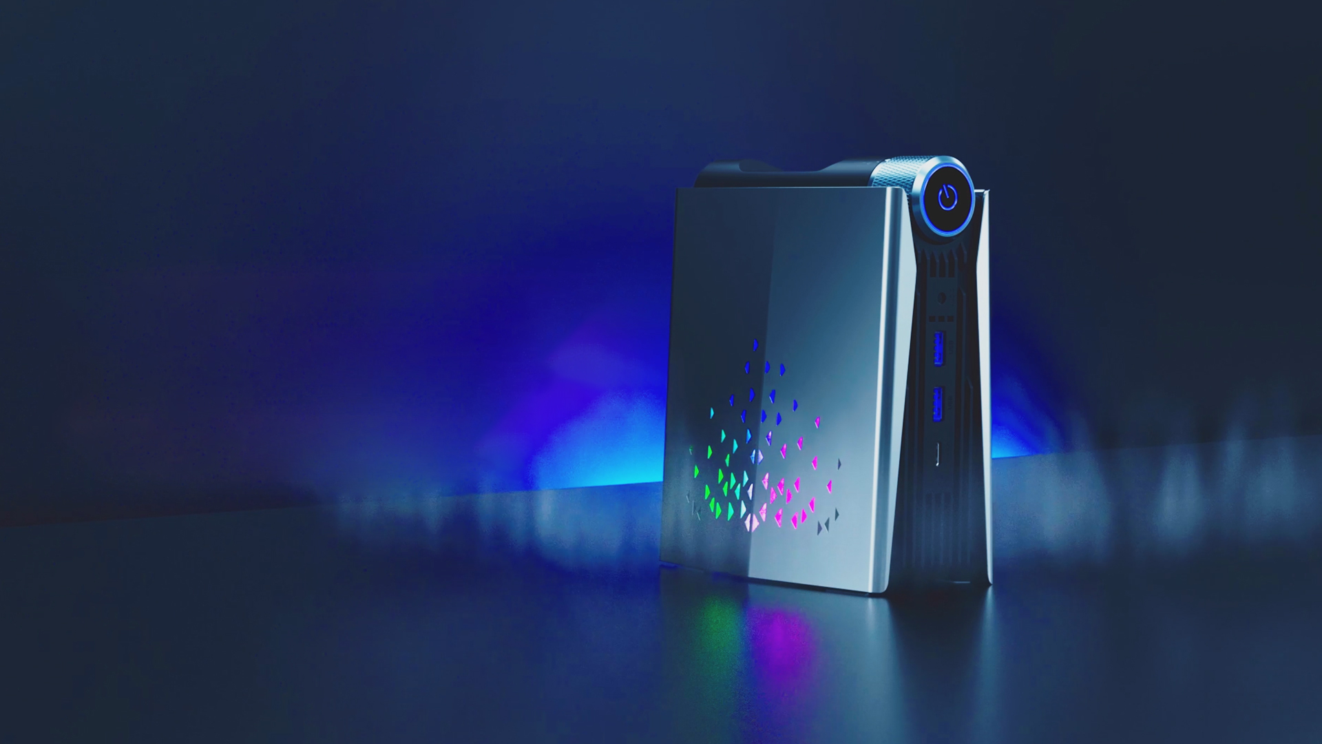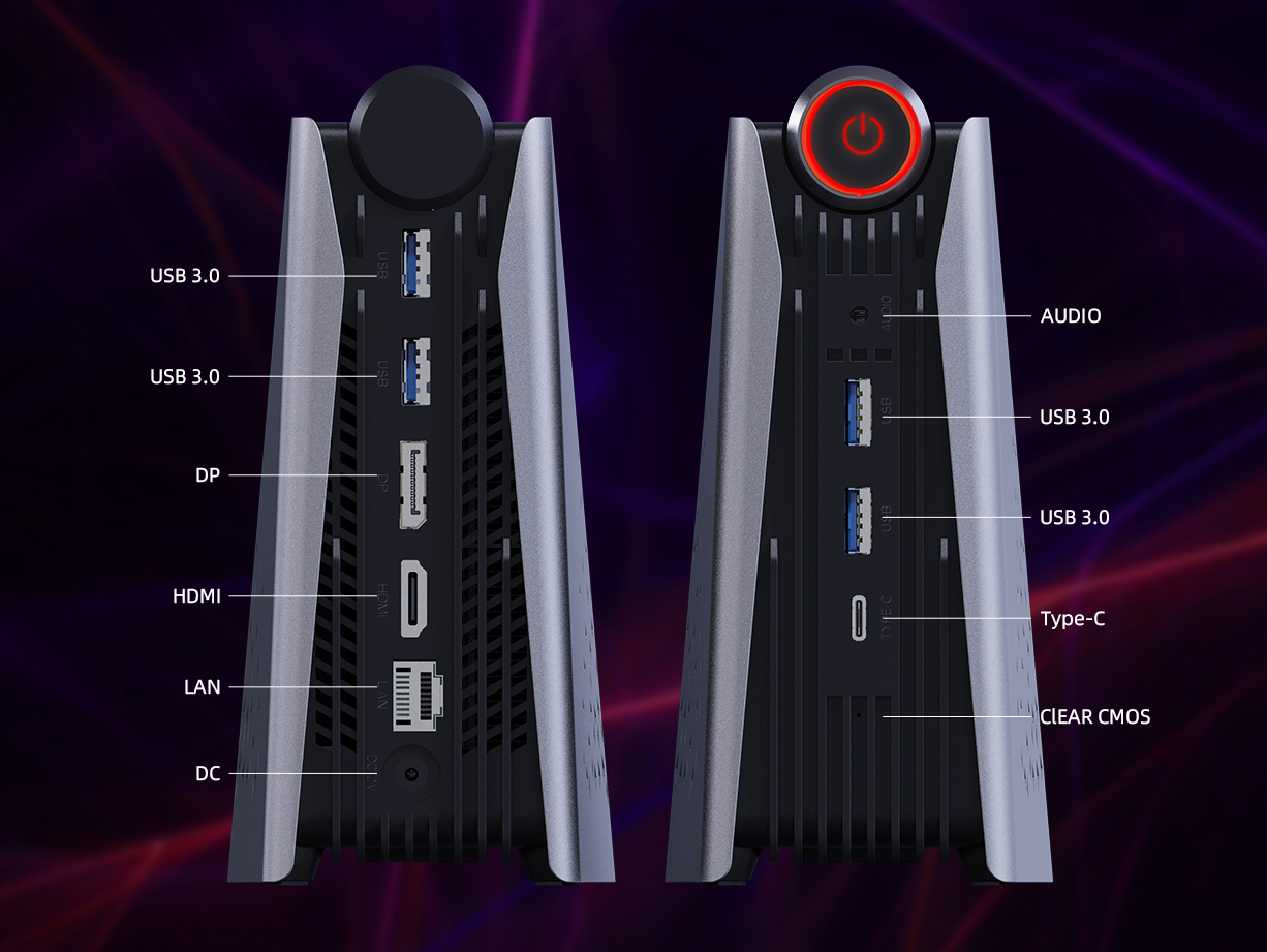 AMR5 外壳呈现金属色,表面光滑。由于外壳嵌有RGB灯,我们在运行AMR5时,可以看到MINI PC环绕的灯光效果,三种不同颜色组成一个三角形造型。在娱乐中,氛围非常重要,AMR5的酷炫灯光,仿佛在为我们的游戏竞技而加油鼓劲。AMR5的RGB灯效设计非常克制,仅有顶部圆柱体的电源键、以及侧面进气孔的部分区域有RGB灯效。