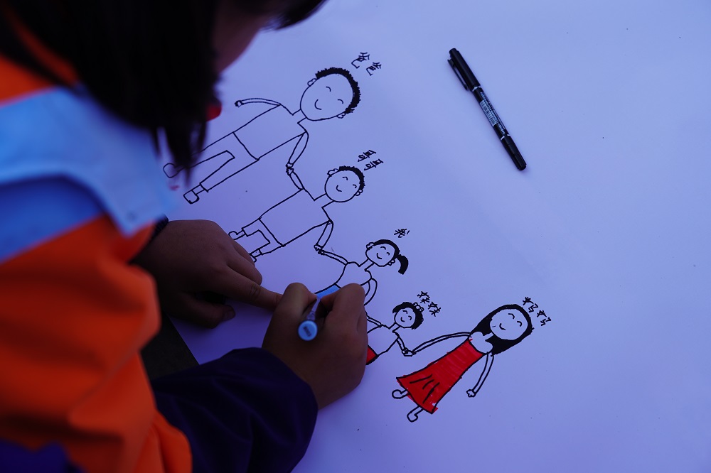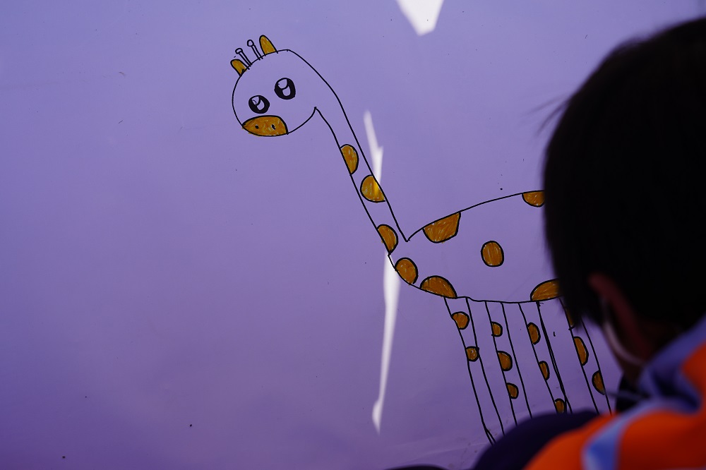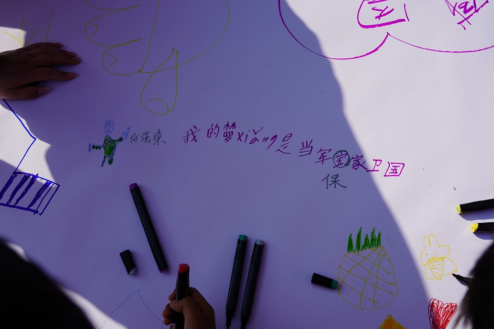 上午10:00全场进行《绘制梦想图》,可爱的孩子们在白纸绘制自己心中的梦想(想法),小朋友们大显身手,在白纸上尽情涂抹。很多孩子在画布上写下自己希望成为军人、老师、医生、消防员等;更多孩子画上家人欢聚的画面;也有孩子画上美丽可爱的小动物。