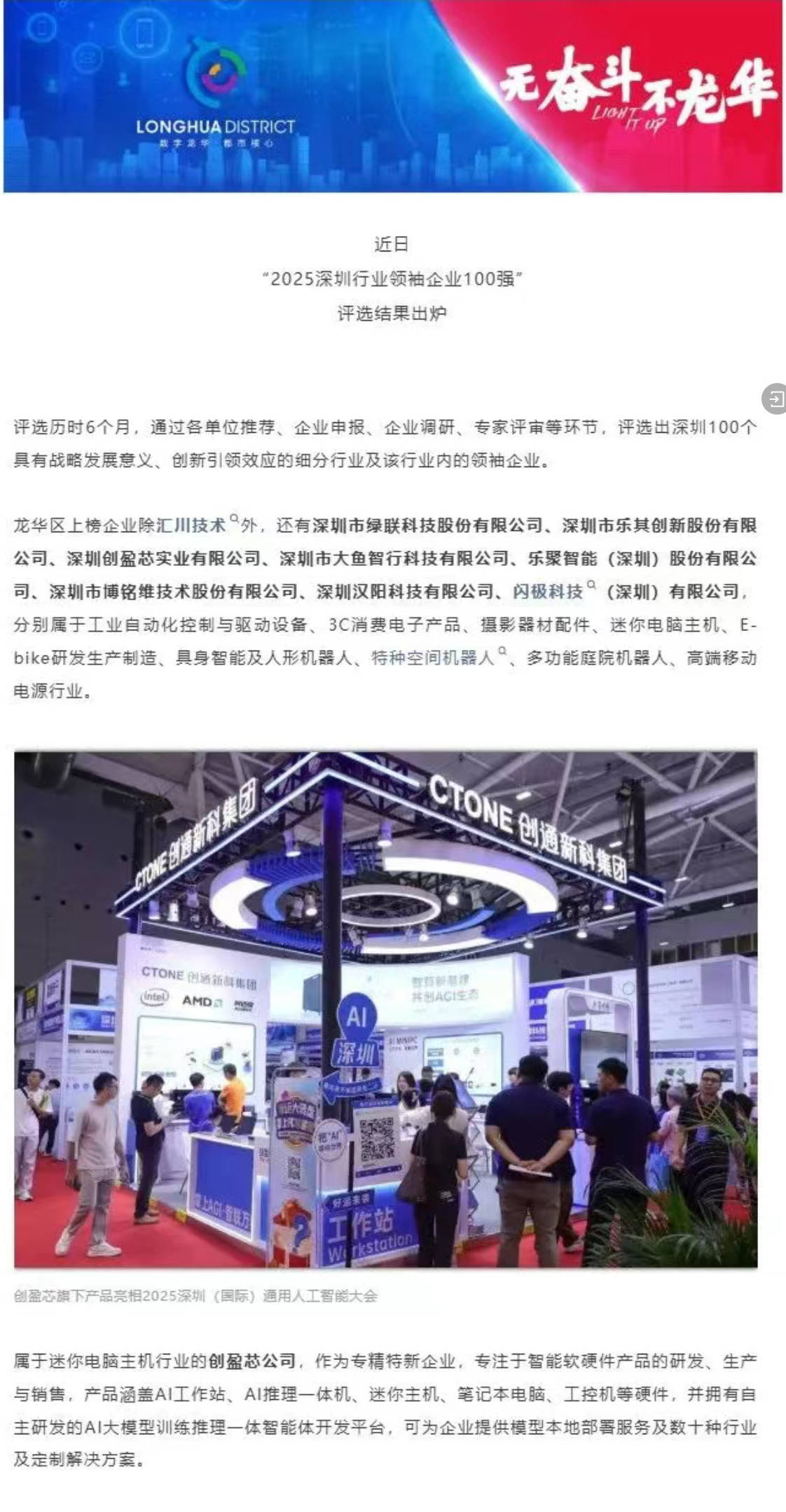 在刚刚揭晓的“2025深圳行业领袖企业100强”榜单中,创通新科集团核心子公司——深圳创盈芯实业有限公司成功蝉联。这是我司自2024年首度获评后,连续第二年荣登这一权威榜单,充分彰显了公司在迷你电脑主机与人工智能硬件领域持续的创新活力与行业领袖地位。