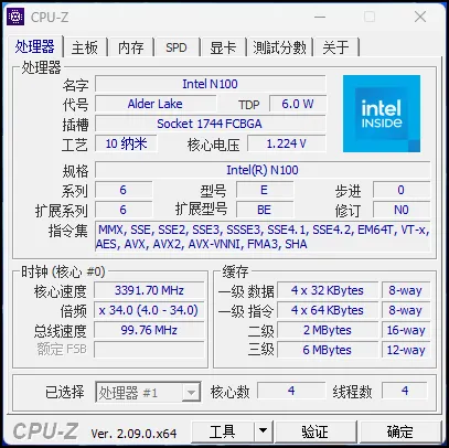 看完了硬件设计,下面咱们再来看看阿迈奇S1的实测性能。该产品搭载了大家已经非常熟悉的英特尔N100,咱们可以将它理解为只有4个小核(E核心)的12/13代酷睿处理器,最高睿频3.4GHz,集成24个EU单元,750MHz的UHD核显,默认TDP仅有6W,主打极致的超低功耗。